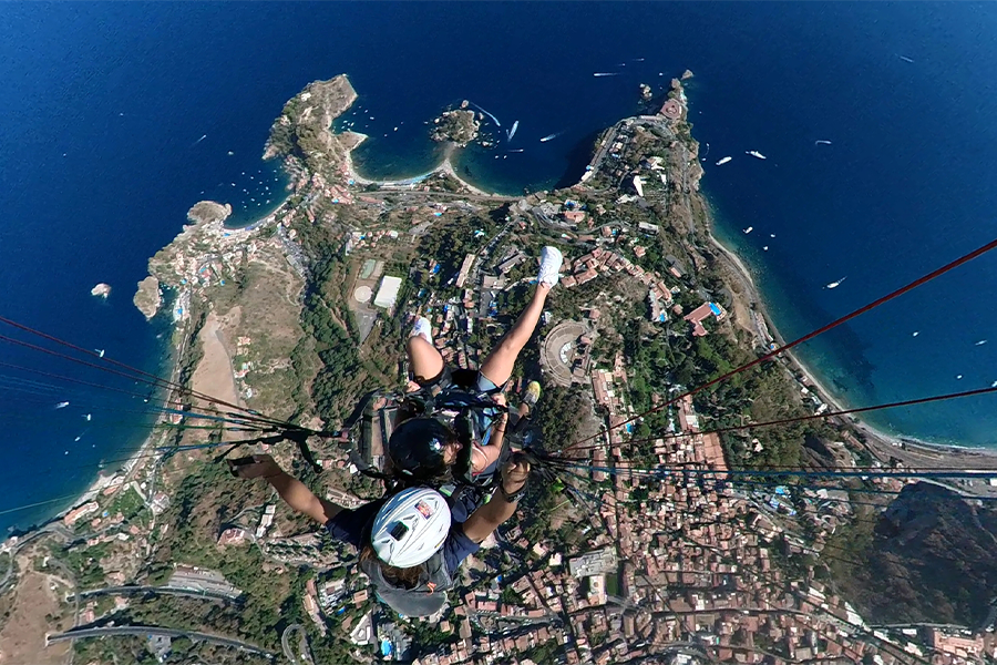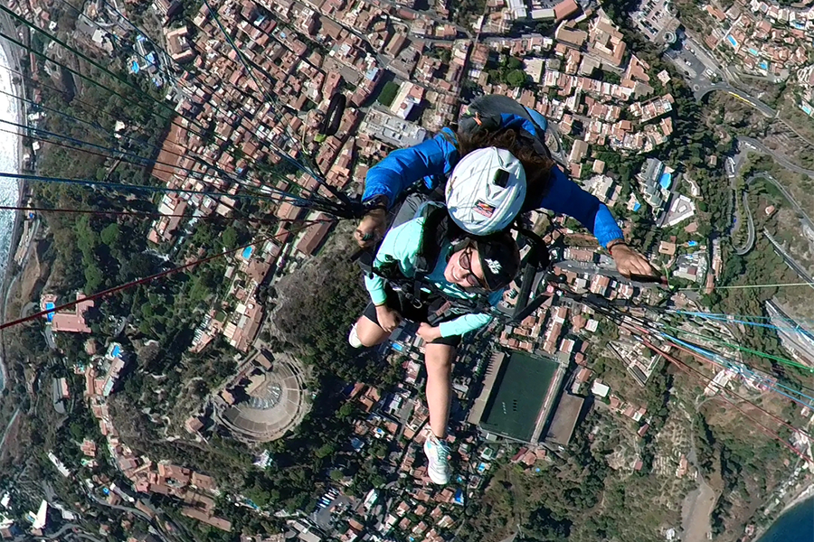 Il volo parte da Castelmola, a circa 800 metri di altitudine, e sorvola Taormina, l’Isola Bella, il Teatro Greco e la costa ionica.